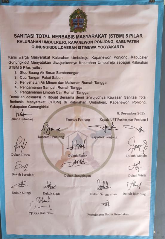 Umbulrejo ( SIDA ) — Senin 8/ 12 / 2025, Pemerintah Kalurahan Umbulrejo pada hari ini resmi melaksanakan Deklarasi Sanitasi Total Berbasis Masyarakat (STBM) 5 Pilar sebagai wujud komitmen mewujudkan lingkungan sehat dan masyarakat berperilaku hidup bersih. Kegiatan ini menjadi deklarasi ke–64 dari total 144 kalurahan yang ada di Kabupaten Gunungkidul.