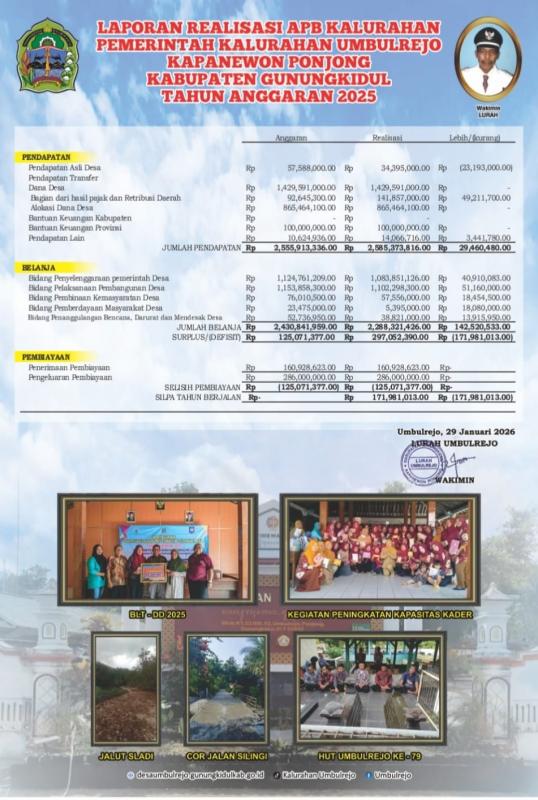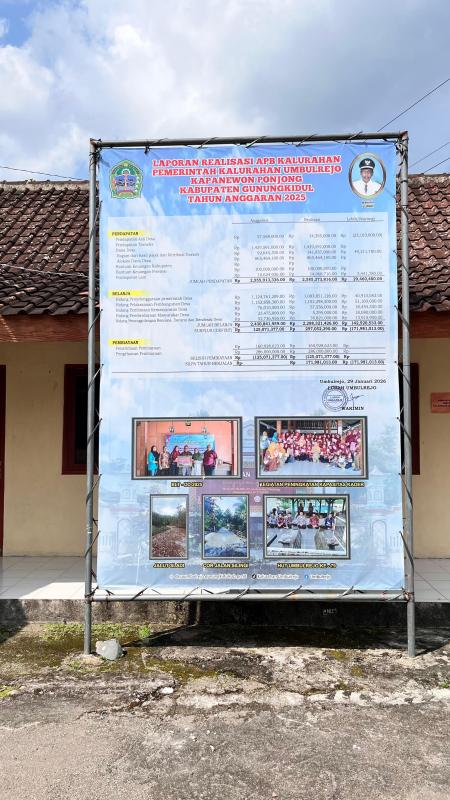 Umbulrejo ( SIDA ), Sesuai UU No. 14 Tahun 2008 tentang Keterbukaan Informasi Publik, Peraturan Kalurahan Umbulrejo No. 1 Tahun 2026 tentang Laporan Pertanggungjawaban Realisasi Anggaran Pendapatan dan Belanja Kalurahan Tahun 2026 telah kami sampaikan secara terbuka melalui media berikut sesuai dengan lampiran Peraturan Kalurahan tersebut diatas./Bps
